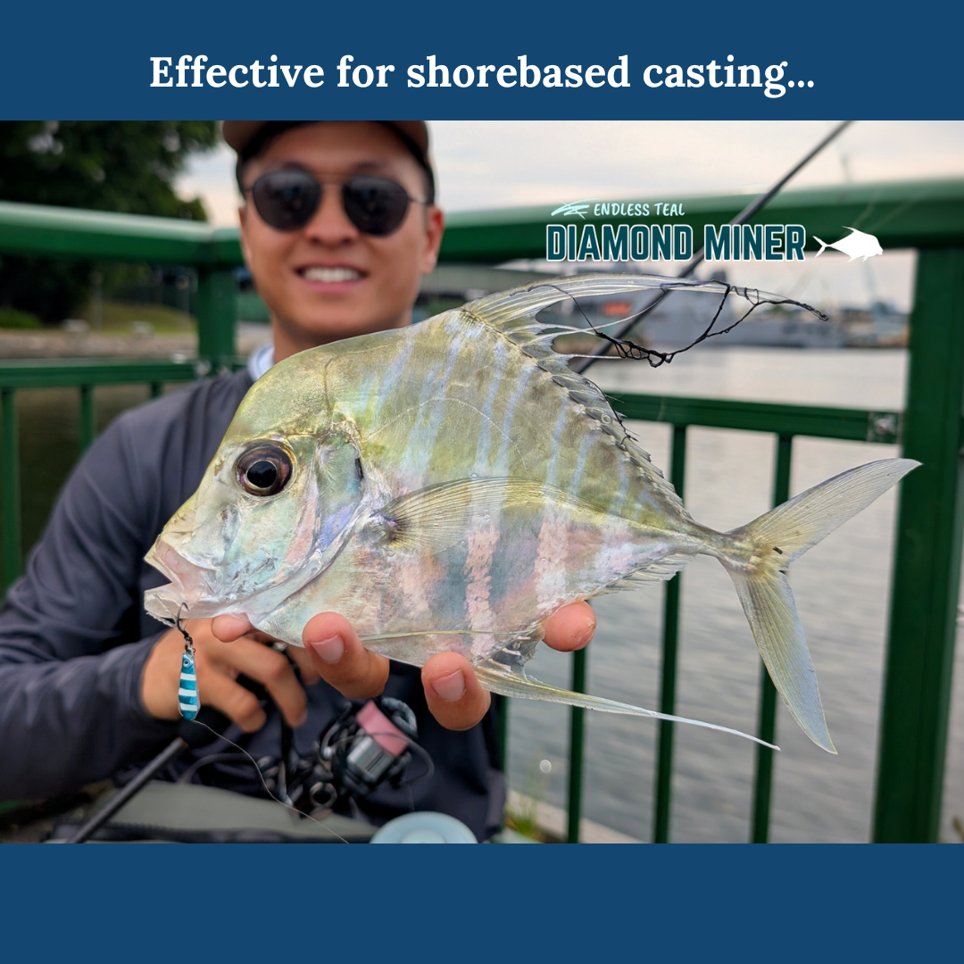 Designed for hunting the elusive Diamond Trevally, from the highly pressured shores of Singapore. Made of 95% Tungsten composite, which allows an ultra-compact profile. Its rear-weighted design allows for excellent casting & sinking, even in strong wind & current. Its unique contours produces a life-like flutter on the lift & fall, enticing even the most finicky predators.